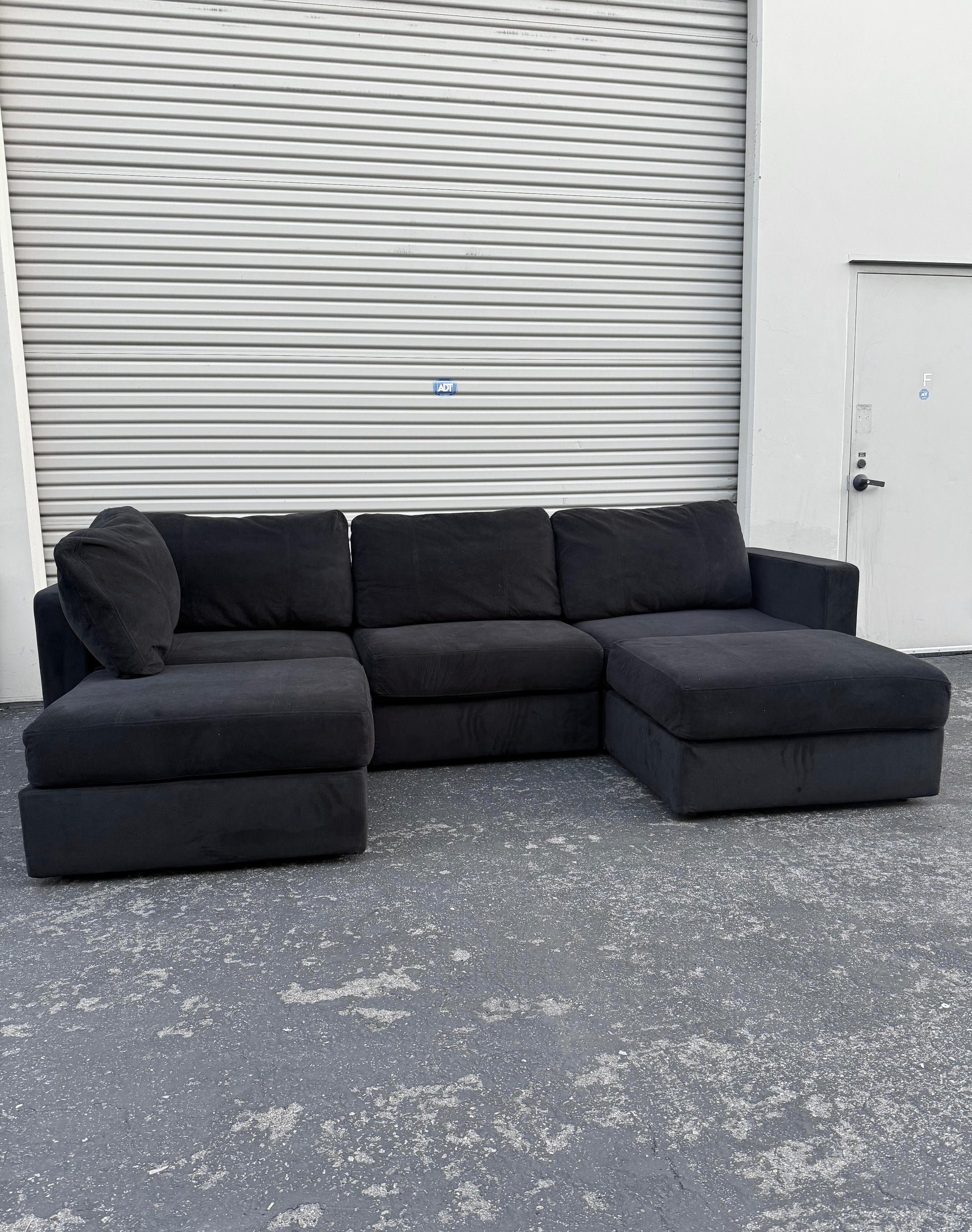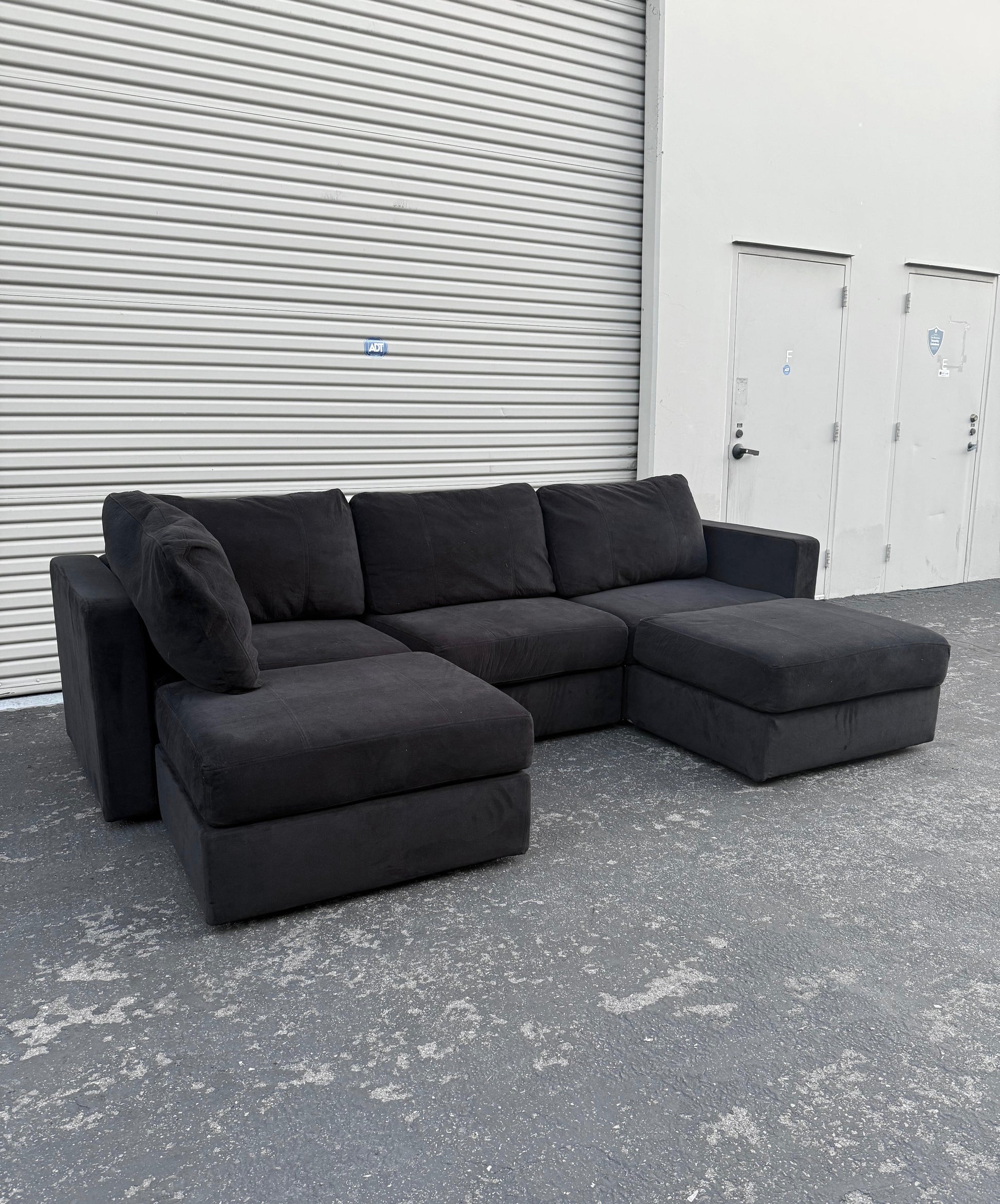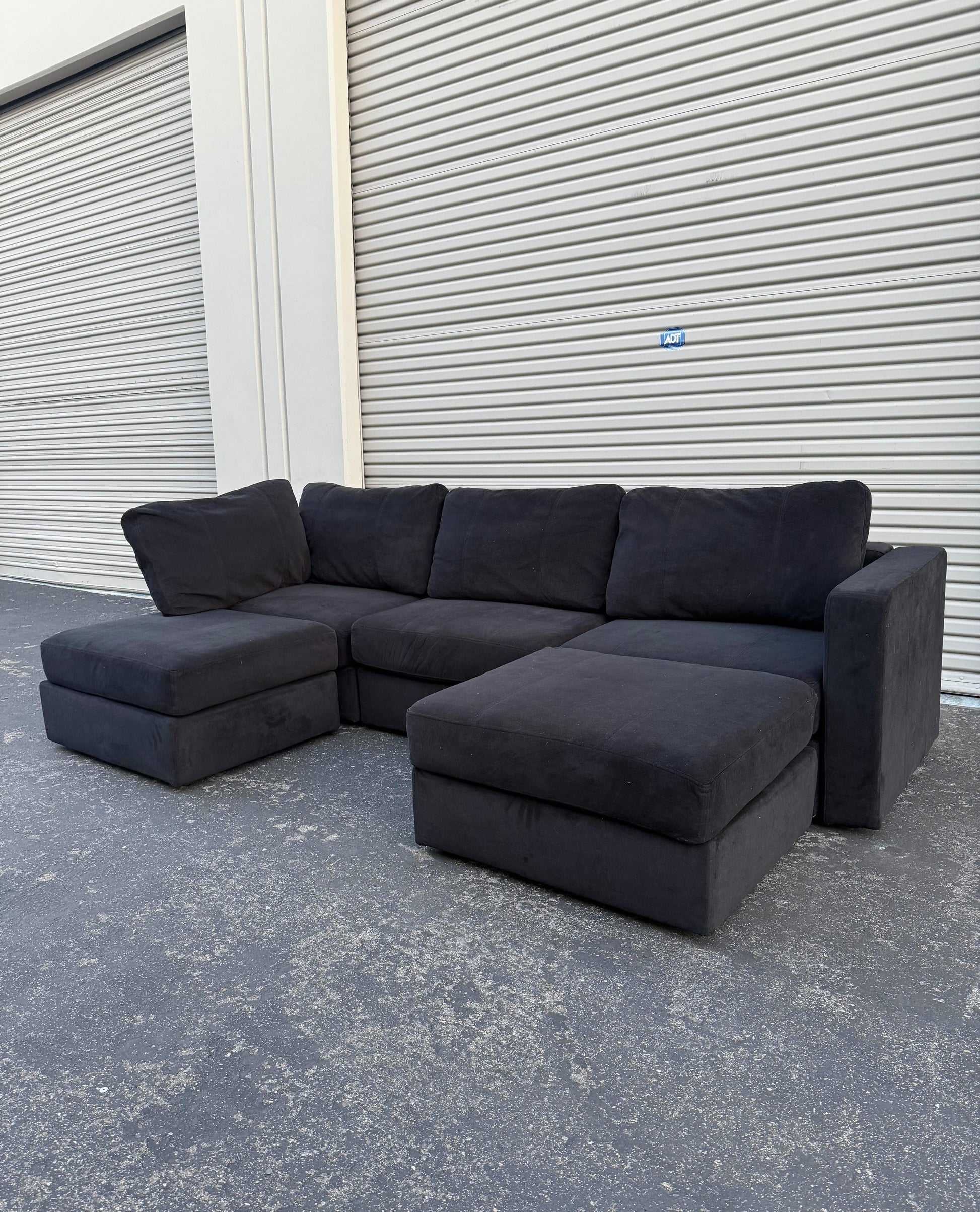 It includes 5 seats, 5 sides, 4 back cushions, steel clamps, and wood bases.