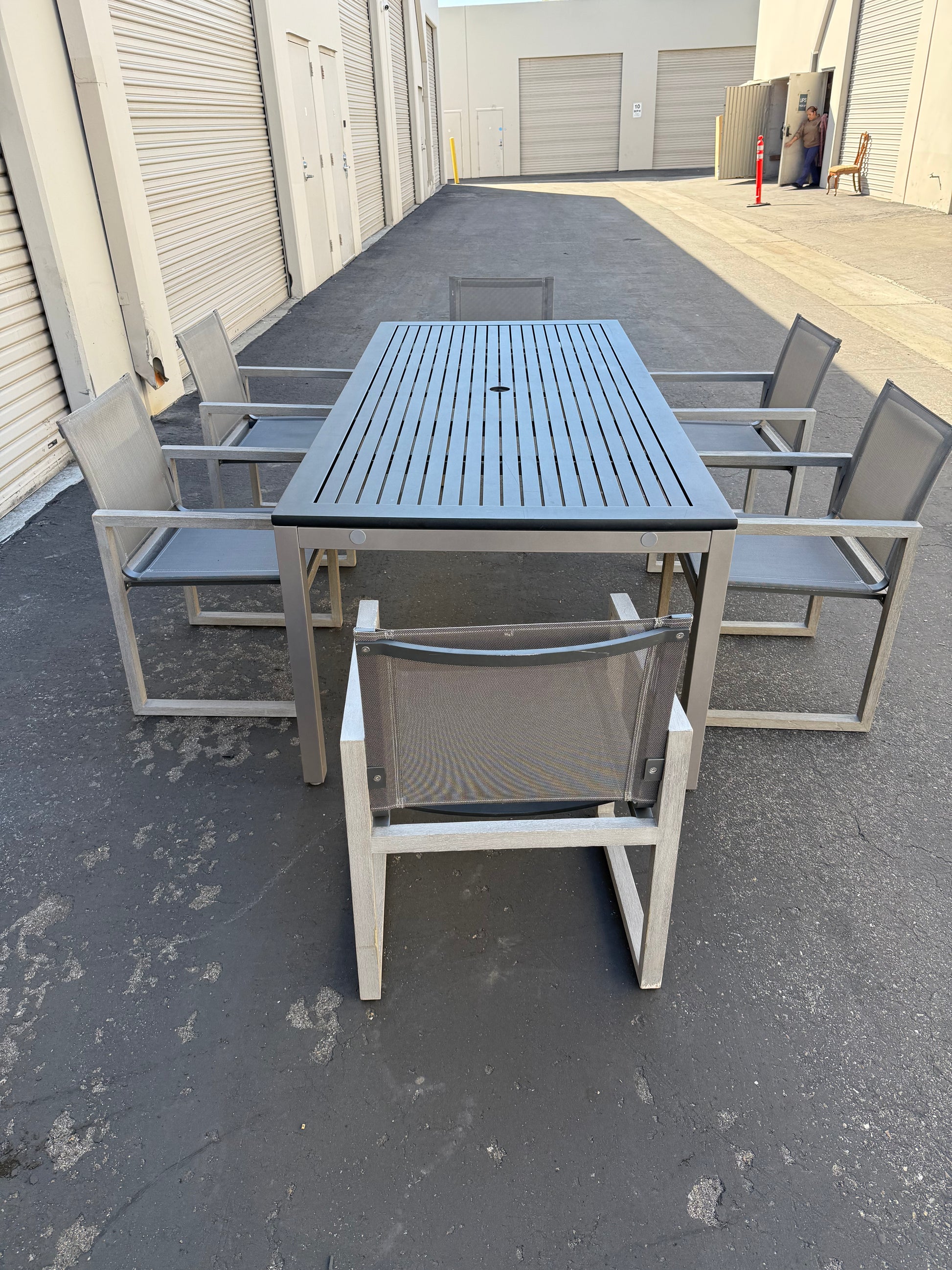 Restoration Hardware Aegean dining table with matching chairs, finished in weathered teak with charcoal mesh seating. Solid and well-built set for outdoors and indoors and in excellent condition!