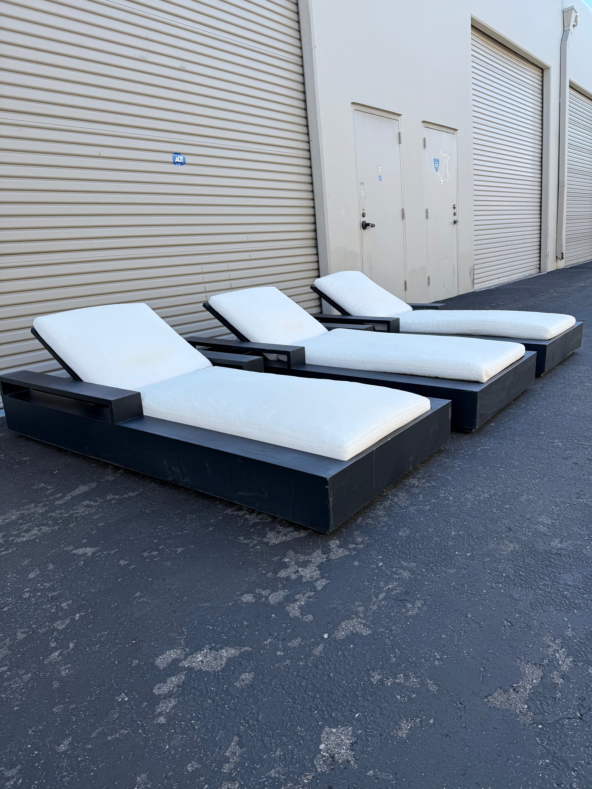 Restoration Hardware Marbella Aluminum Chaise, set of 3 in very good condition. Perennials Performance White Fabric. Adjustable back.