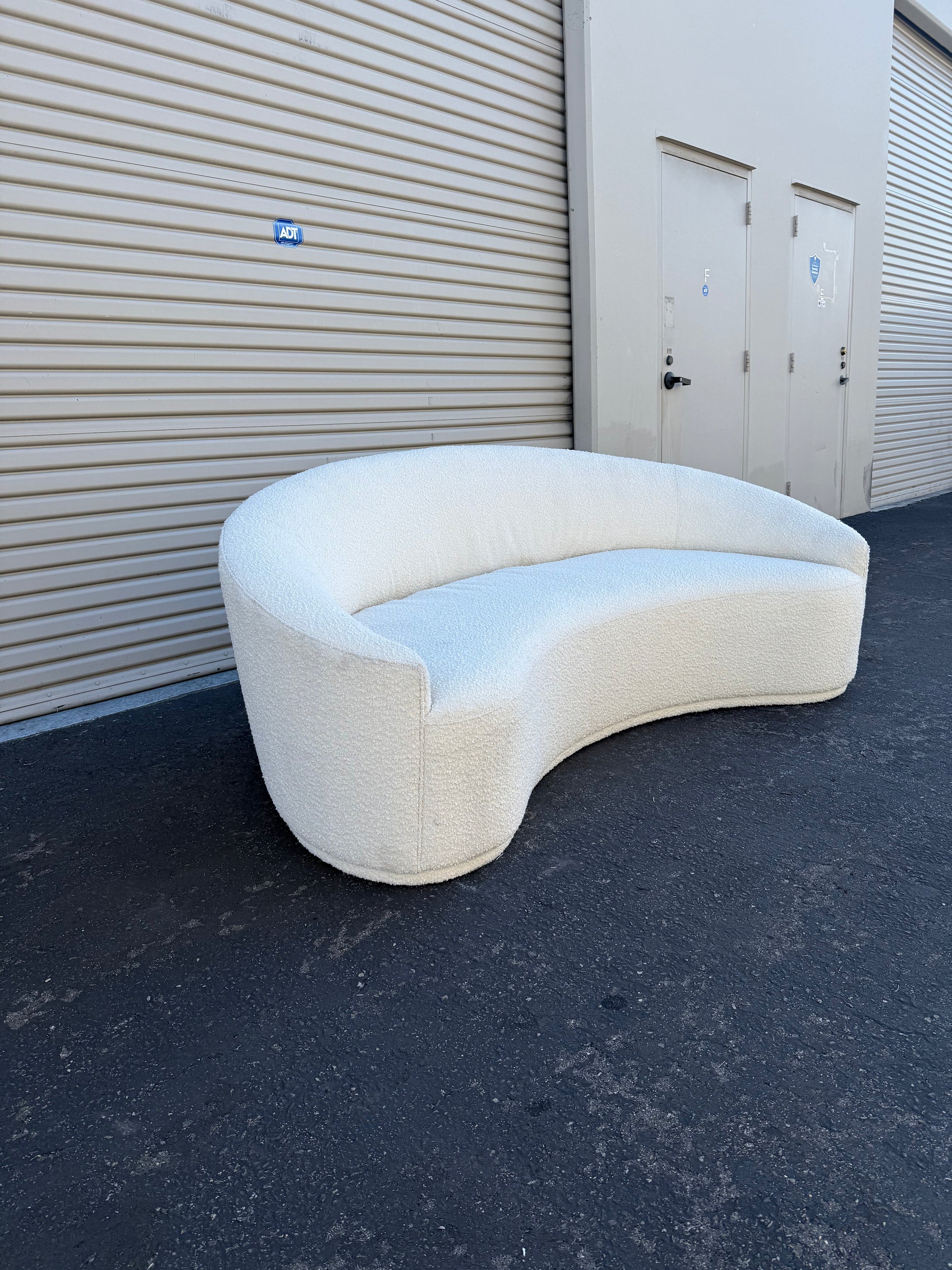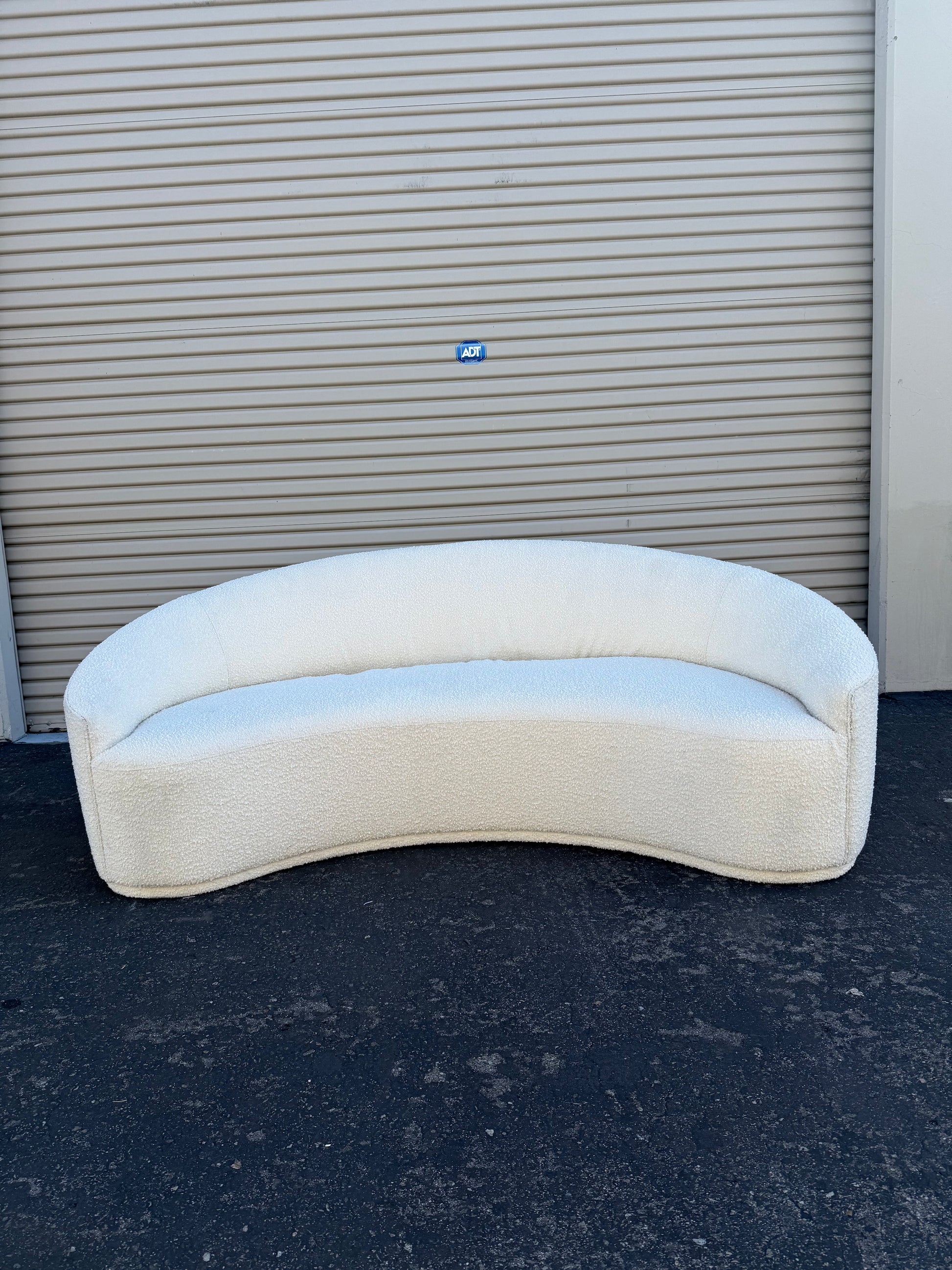 Performance classic bouclé fabric Ellera sofa from Restoration Hardware in white color.